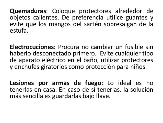 - 9. Quemaduras: Coloque protectores alrededor de objetos calientes. De preferencia utilice guantes y evite que los mangos del sartén sobresalgan de la estufa. Electrocuciones: Procura no cambiar un fusible sin haberlo desconectado primero. Evite cualquier tipo de aparato eléctrico en el baño, utilizar protectores y enchufes giratorios como protección para niños. Lesiones por armas de fuego: Lo ideal es no tenerlas en casa. En caso de sí tenerlas, la solución más sencilla es guardarlas bajo llave.