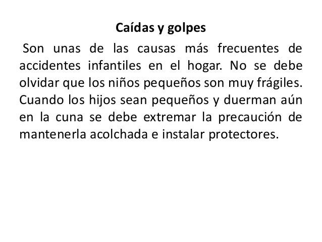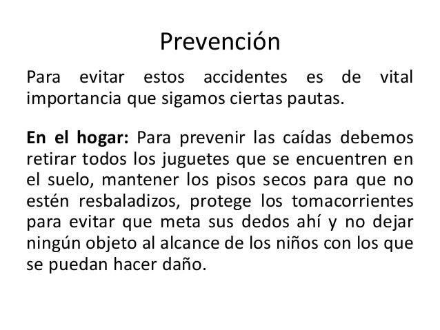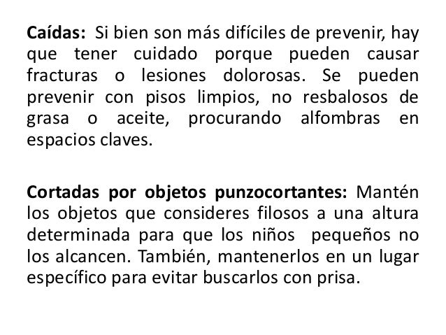 - 10. Caídas: Si bien son más difíciles de prevenir, hay que tener cuidado porque pueden causar fracturas o lesiones dolorosas. Se pueden prevenir con pisos limpios, no resbalosos de grasa o aceite, procurando alfombras en espacios claves. Cortadas por objetos punzocortantes: Mantén los objetos que consideres filosos a una altura determinada para que los niños pequeños no los alcancen. También, mantenerlos en un lugar específico para evitar buscarlos con prisa.