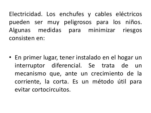- 13. Electricidad. Los enchufes y cables eléctricos pueden ser muy peligrosos para los niños. Algunas medidas para minimizar riesgos consisten en: • En primer lugar, tener instalado en el hogar un interruptor diferencial. Se trata de un mecanismo que, ante un crecimiento de la corriente, la corta. Es un método útil para evitar cortocircuitos.