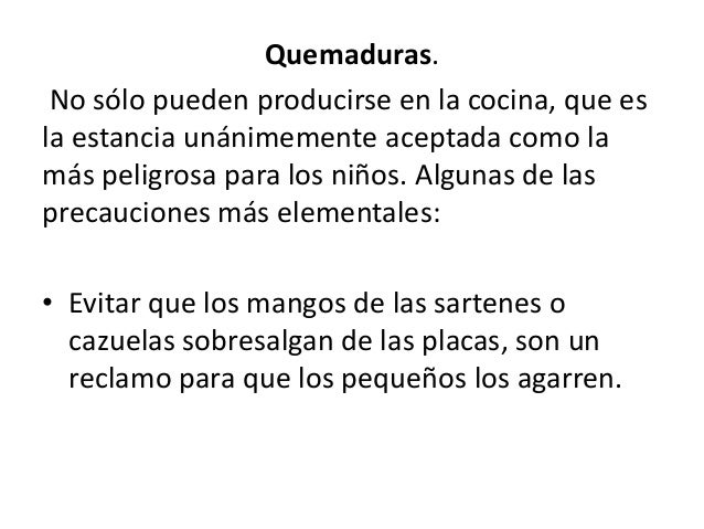 - 15. Quemaduras. No sólo pueden producirse en la cocina, que es la estancia unánimemente aceptada como la más peligrosa para los niños. Algunas de las precauciones más elementales: • Evitar que los mangos de las sartenes o cazuelas sobresalgan de las placas, son un reclamo para que los pequeños los agarren.