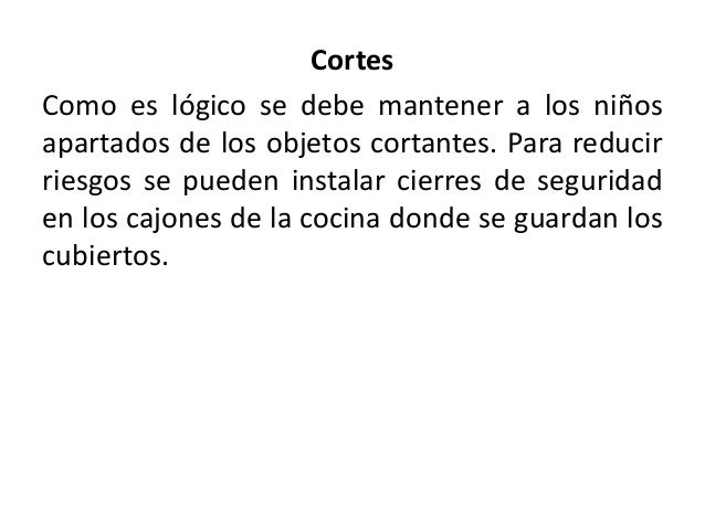 - 17. Cortes Como es lógico se debe mantener a los niños apartados de los objetos cortantes. Para reducir riesgos se pueden instalar cierres de seguridad en los cajones de la cocina donde se guardan los cubiertos.