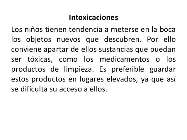 - 18. Intoxicaciones Los niños tienen tendencia a meterse en la boca los objetos nuevos que descubren. Por ello conviene apartar de ellos sustancias que puedan ser tóxicas, como los medicamentos o los productos de limpieza. Es preferible guardar estos productos en lugares elevados, ya que así se dificulta su acceso a ellos.