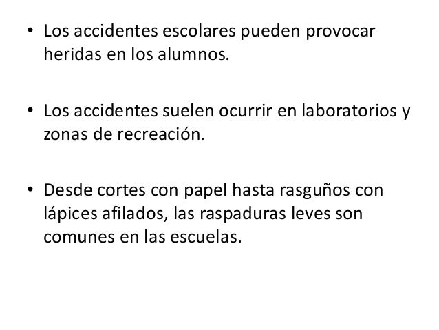 - 21. • Los accidentes escolares pueden provocar heridas en los alumnos. • Los accidentes suelen ocurrir en laboratorios y zonas de recreación. • Desde cortes con papel hasta rasguños con lápices afilados, las raspaduras leves son comunes en las escuelas.