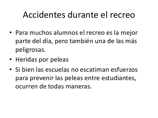 - 22. Accidentes durante el recreo • Para muchos alumnos el recreo es la mejor parte del día, pero también una de las más peligrosas. • Heridas por peleas • Si bien las escuelas no escatiman esfuerzos para prevenir las peleas entre estudiantes, ocurren de todas maneras.