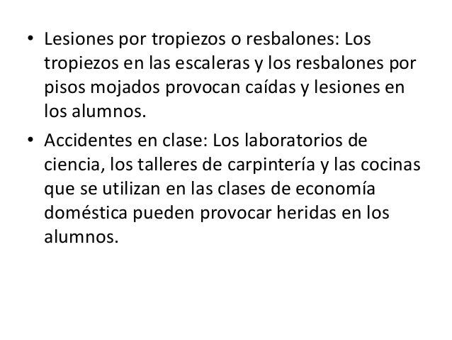 - 23. • Lesiones por tropiezos o resbalones: Los tropiezos en las escaleras y los resbalones por pisos mojados provocan caídas y lesiones en los alumnos. • Accidentes en clase: Los laboratorios de ciencia, los talleres de carpintería y las cocinas que se utilizan en las clases de economía doméstica pueden provocar heridas en los alumnos.