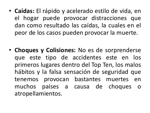 - 25. • Caídas: El rápido y acelerado estilo de vida, en el hogar puede provocar distracciones que dan como resultado las caídas, la cuales en el peor de los casos pueden provocar la muerte. • Choques y Colisiones: No es de sorprenderse que este tipo de accidentes este en los primeros lugares dentro del Top Ten, los malos hábitos y la falsa sensación de seguridad que tenemos provocan bastantes muertes en muchos países a causa de choques o atropellamientos.