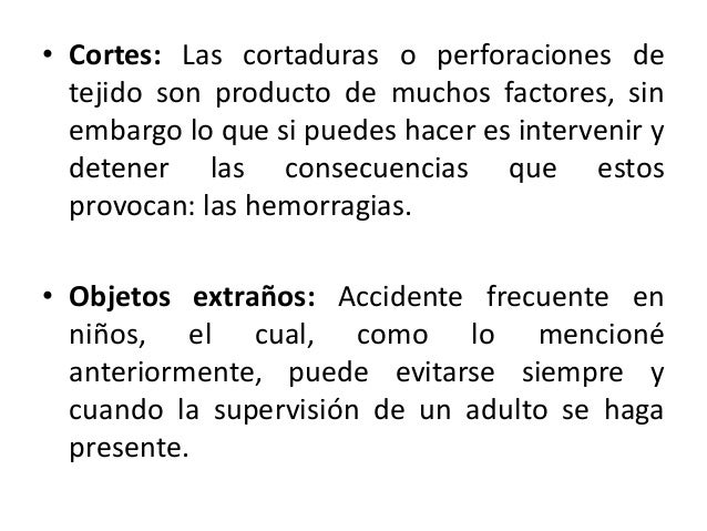 - 26. • Cortes: Las cortaduras o perforaciones de tejido son producto de muchos factores, sin embargo lo que si puedes hacer es intervenir y detener las consecuencias que estos provocan: las hemorragias. • Objetos extraños: Accidente frecuente en niños, el cual, como lo mencioné anteriormente, puede evitarse siempre y cuando la supervisión de un adulto se haga presente.