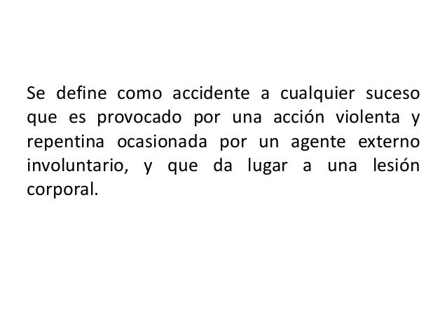 - 2. Se define como accidente a cualquier suceso que es provocado por una acción violenta y repentina ocasionada por un agente externo involuntario, y que da lugar a una lesión corporal.