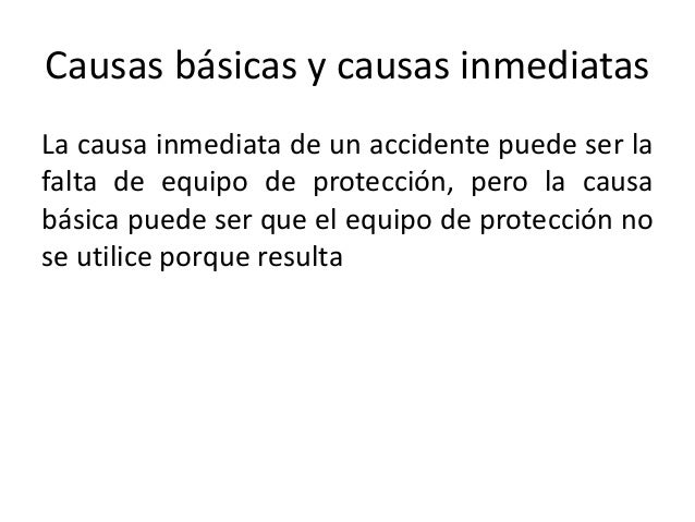 - 3. Causas básicas y causas inmediatas La causa inmediata de un accidente puede ser la falta de equipo de protección, pero la causa básica puede ser que el equipo de protección no se utilice porque resulta