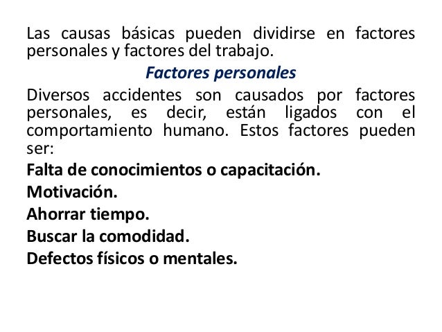 - 4. Las causas básicas pueden dividirse en factores personales y factores del trabajo. Factores personales Diversos accidentes son causados por factores personales, es decir, están ligados con el comportamiento humano. Estos factores pueden ser: Falta de conocimientos o capacitación. Motivación. Ahorrar tiempo. Buscar la comodidad. Defectos físicos o mentales.