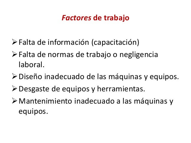 - 5. Factores de trabajo Falta de información (capacitación) Falta de normas de trabajo o negligencia laboral. Diseño inadecuado de las máquinas y equipos. Desgaste de equipos y herramientas. Mantenimiento inadecuado a las máquinas y equipos.
