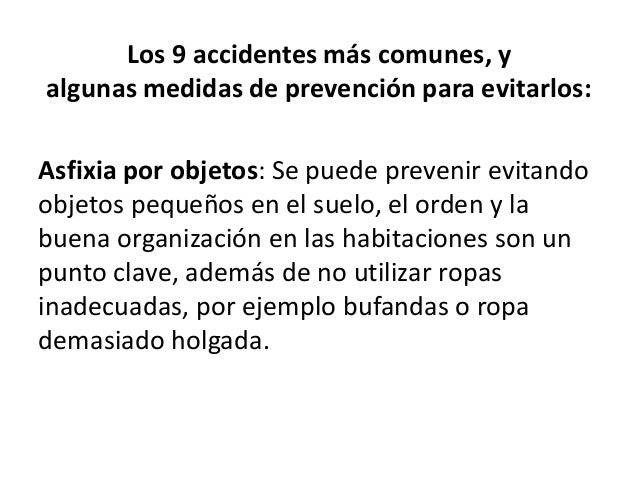 - 7. Los 9 accidentes más comunes, y algunas medidas de prevención para evitarlos: Asfixia por objetos: Se puede prevenir evitando objetos pequeños en el suelo, el orden y la buena organización en las habitaciones son un punto clave, además de no utilizar ropas inadecuadas, por ejemplo bufandas o ropa demasiado holgada.