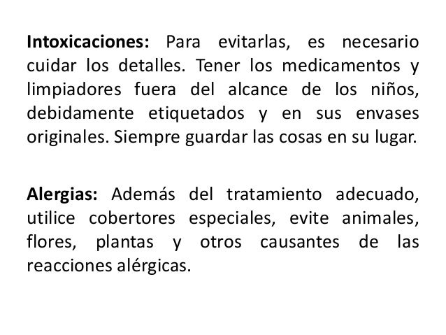 - 8. Intoxicaciones: Para evitarlas, es necesario cuidar los detalles. Tener los medicamentos y limpiadores fuera del alcance de los niños, debidamente etiquetados y en sus envases originales. Siempre guardar las cosas en su lugar. Alergias: Además del tratamiento adecuado, utilice cobertores especiales, evite animales, flores, plantas y otros causantes de las reacciones alérgicas.